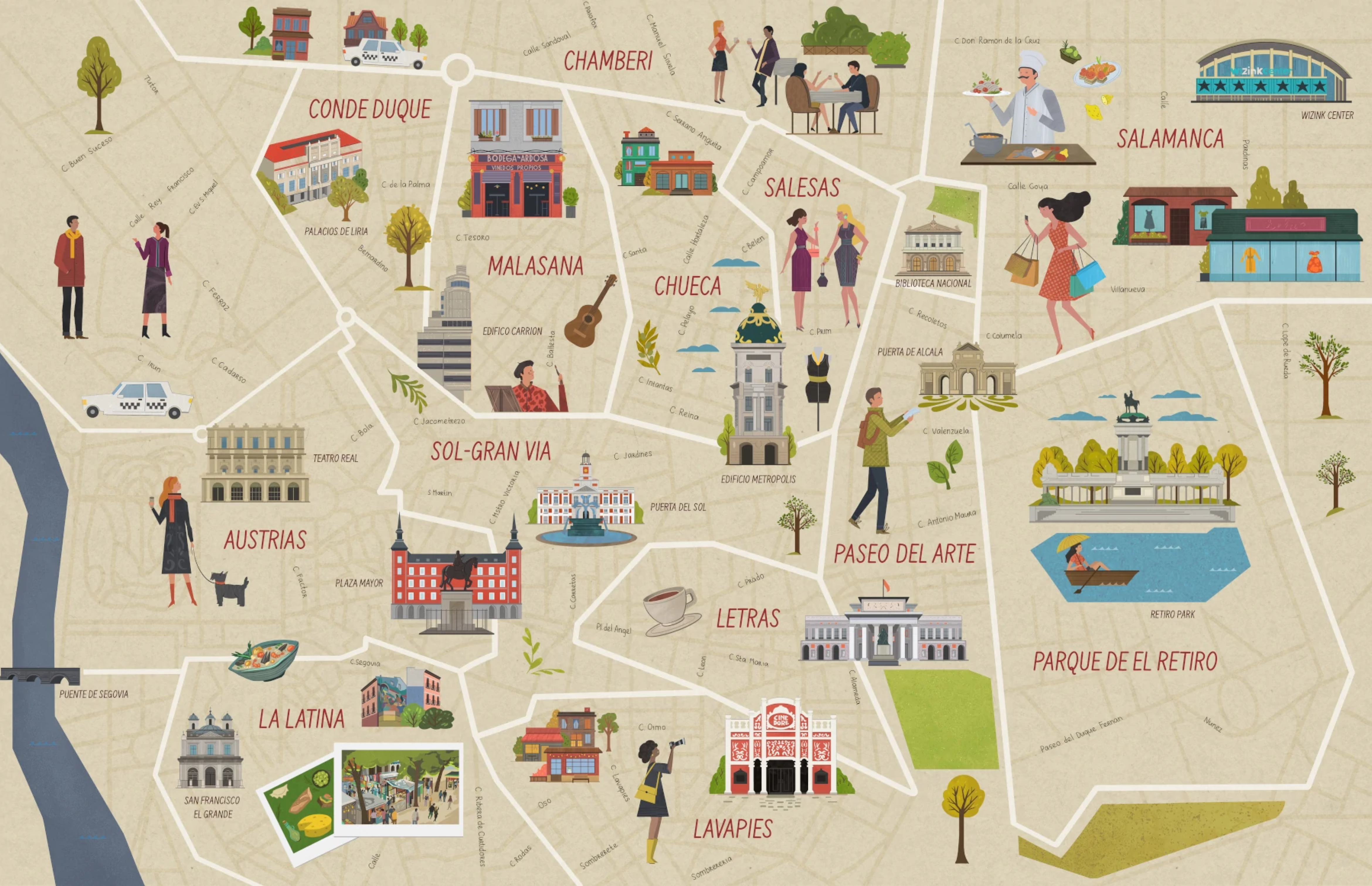 마드리드는 각기 다른 매력을 지닌 131개의 바리오로 구성되어 있습니다. 고급 상점과 레스토랑이 가득한 품격 있는 살라망카부터, 상징적인 엘 라스트로 시장과 마드리드에서 최고로 손꼽히는 타파스 바들이 모여 있는 유서 깊은 라 라티나까지, 이 도시의 다채로운 지역들을 탐방해보세요.